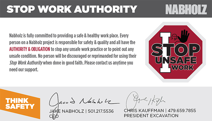 I Stop Unsafe Work is a policy that states that every person on a Nabholz project is responsible for the safety and quality of a job. As such, everyone has the authority and obligation to stop any unsafe work practice or to point out any unsafe condition. No person will be discouraged or reprimanded for using their Stop Work Authority when done in good faith. Each person will receive a card (pictured right) verifying this authority with the signatures of the CEO and region president endorsing their decisions. Cards are available in both English and Spanish.