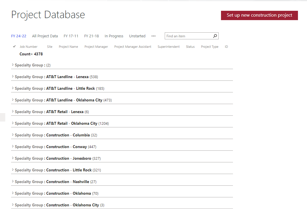 The service database is a resource of all past, current, and upcoming Nabholz projects. The database provides the project’s job number, name, PM, PMA, super, status, project type, and ID. There is also a search function to find a specific project. To get more exact results, you can also filter by year or the project’s status.
