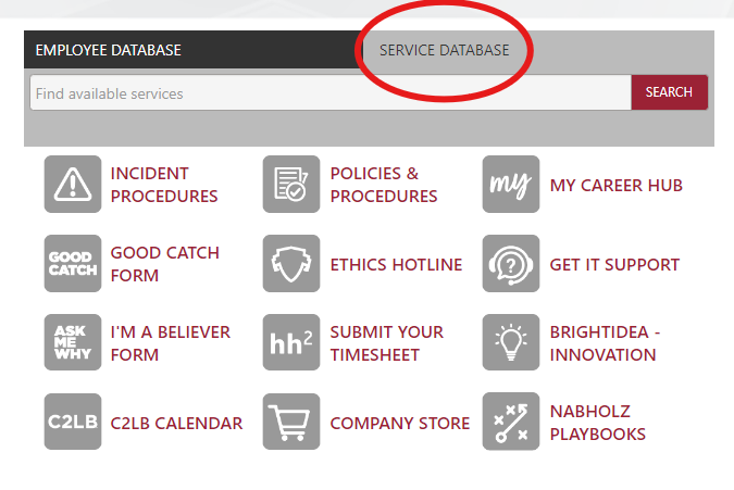 You can access the service database from the SharePoint homepage under the “Our Company” tab.